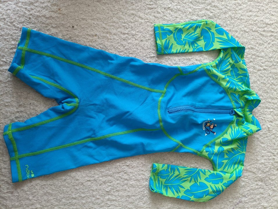 Erkek çocuk mayo, kısa kollu ve canlı mavi renkli. Kollarında yeşil yaprak desenleri bulunur, önünde fermuar vardır. ♂️ Uv korumalıdır