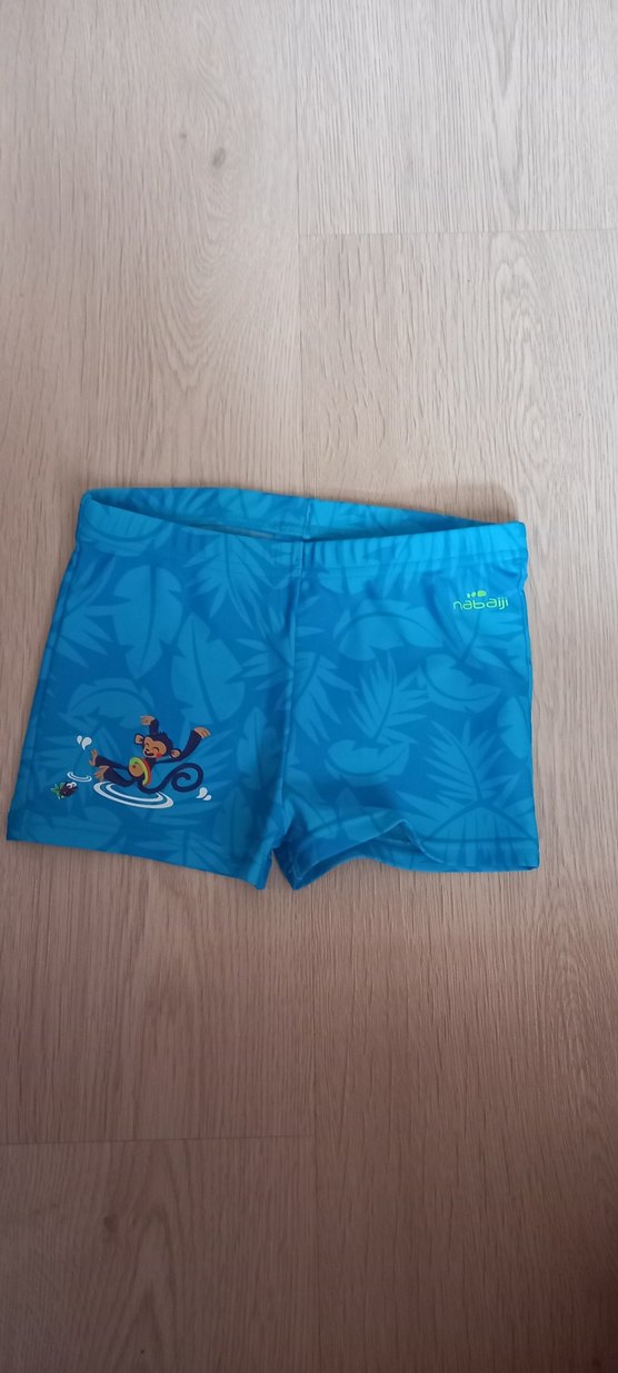 Renkli baskılı, kısa kollu mavi erkek çocuk mayosu, üzerinde eğlenceli maymun figürü bulunur.
