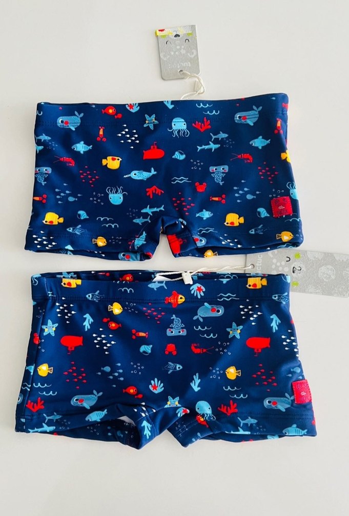 Mavi zemin üzerine deniz canlıları desenli renkli baskılı erkek çocuk mayo şortları, rahat yüzme için uygun.