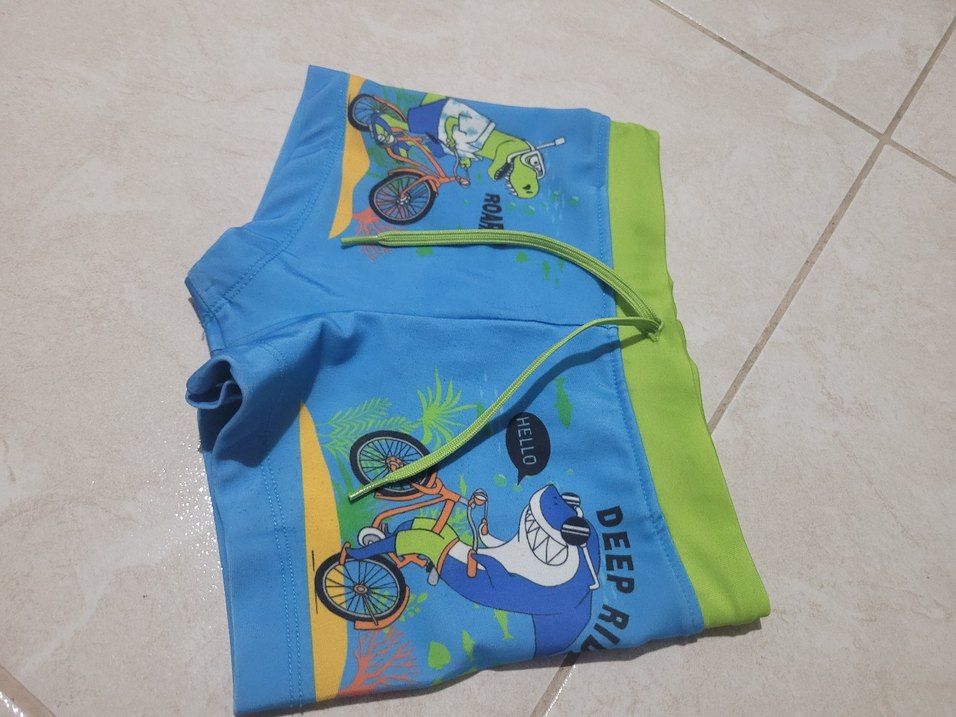 Mavi renkli, kısa kollu ve yeşil bel bantlı, bisiklet ve köpekbalığı baskılı renkli erkek çocuk mayo şortu, üst köpek balıklı yurt dışından alındı uv korumalı ikiside çok iyi durumda