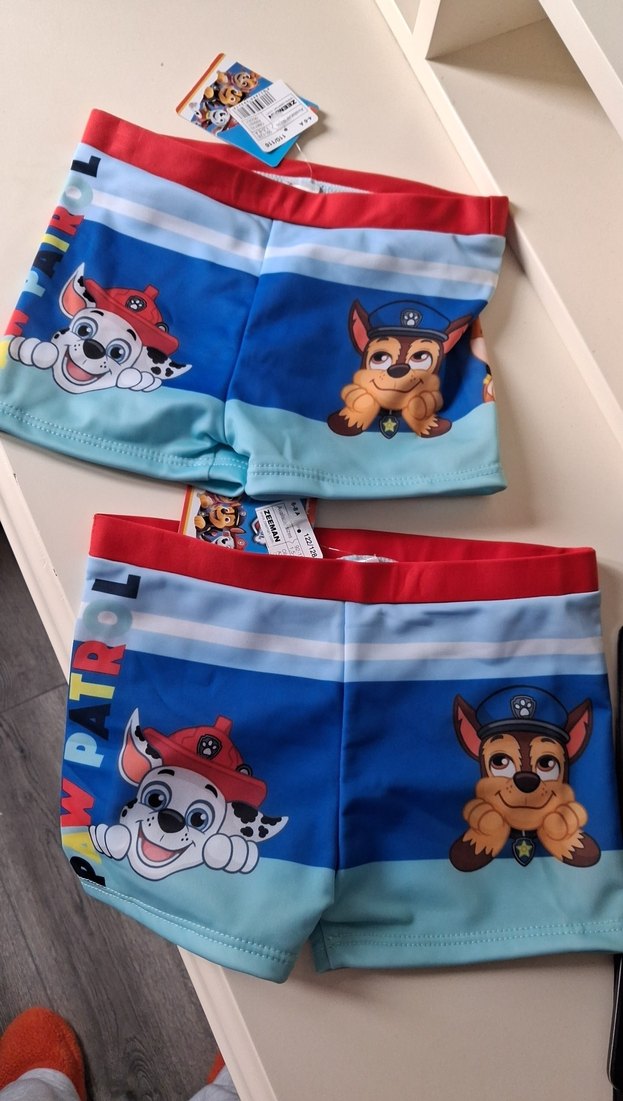 Renkli baskılı Paw Patrol karakterleriyle mavi tabanlı, kırmızı bel bantlı erkek çocuk mayo şortu. Kısa kollu tarzda. yurtdisindan geldi 110cm