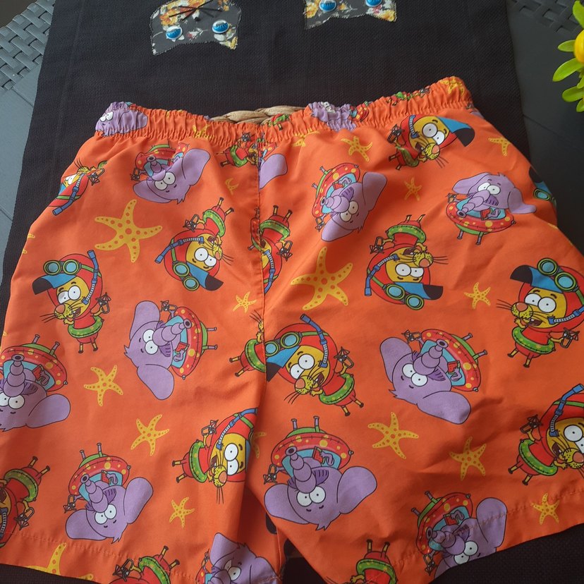 Canlı renklerde baskılı desenli, erkek çocuk mayo şortu. Turuncu zemin üzerinde eğlenceli karakterler ve denizyıldızı figürleri bulunur.