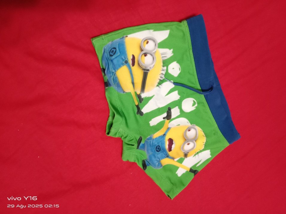 Canlı yeşil zemin üzerinde baskılı Minyonlar figürlü renkli erkek çocuk mayo şortu, kolsuz tarzda.