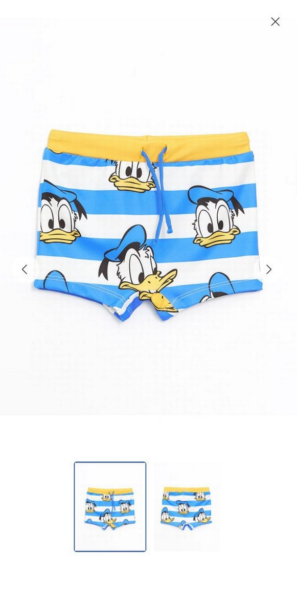 Mavi beyaz çizgili, baskılı çizgi karakter örnekli, sarı bel bantlı ve mavi bağcıklı renkli erkek çocuk mayo şortu.