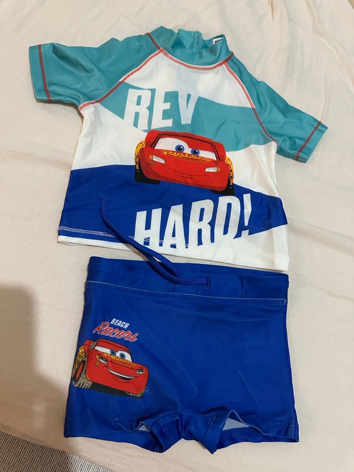 Kısa kollu, renkli baskılı erkek çocuk mayo takımı. Üst kısmında yüksek yaka ve baskılı arabalar, şortta ipli detay bulunur.