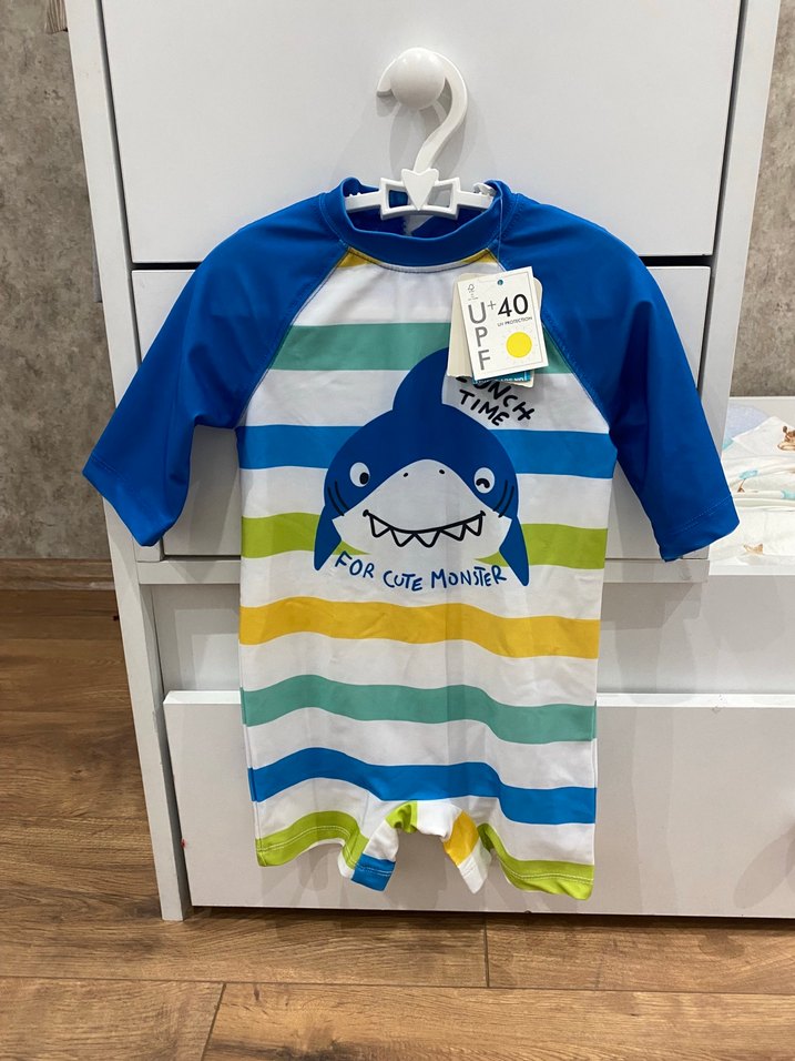 Kısa kollu, renkli çizgili ve köpekbalığı baskılı erkek çocuk mayo tulumu. UPF 40 güneş koruması sağlar. Etiketli hiç giyilmedi LCW WAİKİKİ ÜRÜNÜ. 1,5 -2 yaş uyumlu