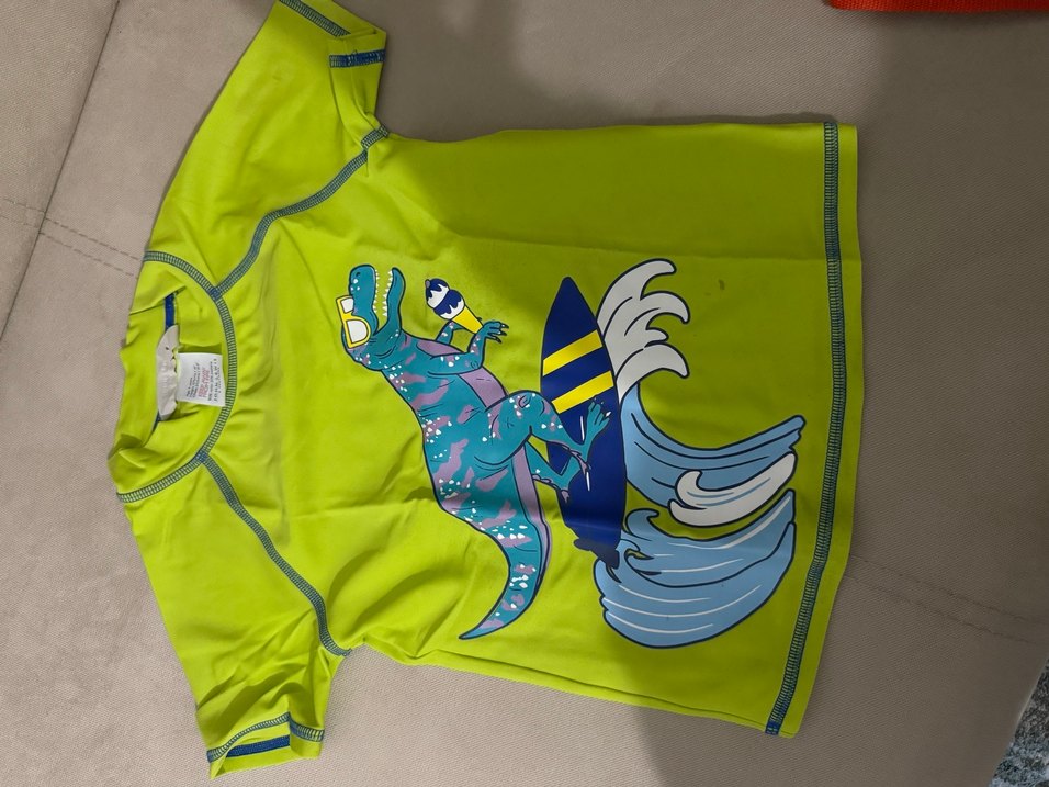 Kısa kollu, renkli baskılı erkek çocuk mayo üstü, yeşil zemin üzerinde dalga ve sörf tahtası tutan dinozor figürü içerir.