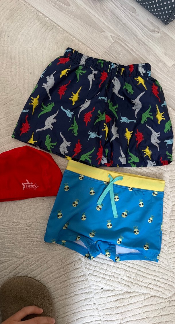 Renkli baskılı erkek çocuk mayo şortları ve kırmızı yüzme şapkası. Şortlarda dinozor ve emoji desenleri bulunur.