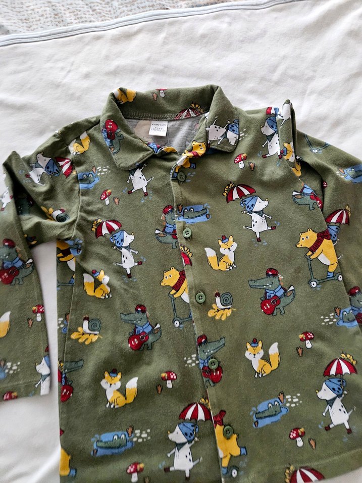Renkli baskılı, düğmeli ve uzun kollu erkek çocuk pijama takımı, bol kesim ve yakalı tasarıma sahiptir. Yeşil zemin üzerine çeşitli hayvan desenleri bulunur.