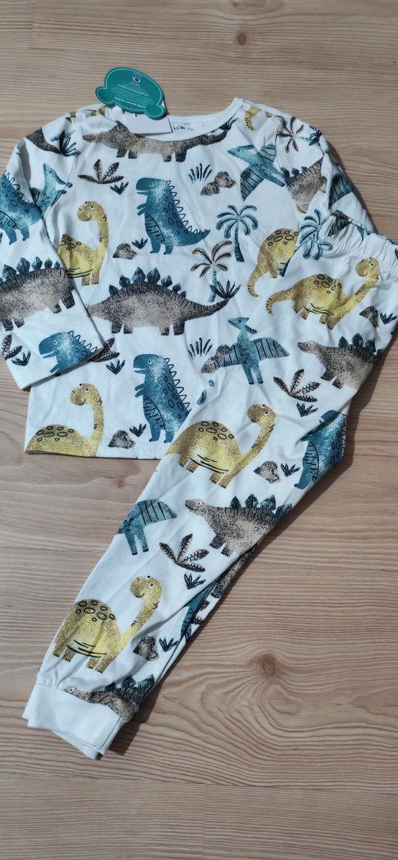 Rahat kesim, uzun kollu ve bisiklet yaka erkek çocuk pijama takımı, beyaz zemin üzerine renkli dinozor baskılarıyla süslenmiştir. 24-36 ay