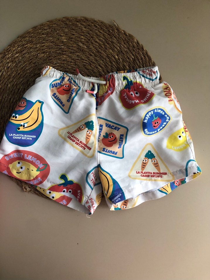 Renkli baskılı meyve desenli erkek çocuk şortu, rahatlık için lastikli bel bantlıdır.