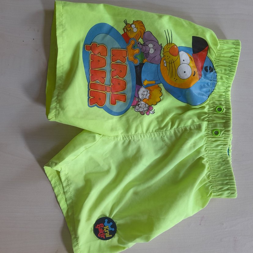 Renkli çizgi film baskılı, elastik bel bantlı yeşil erkek çocuk şortu. Rahat ve canlı tasarım.ic filesi kesiktir