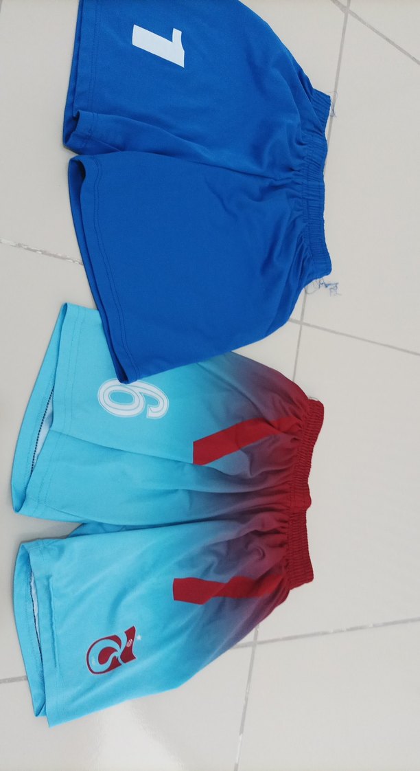 İki adet erkek çocuk mayo şortu, biri düz mavi diğeri renkli baskılı, elastik bel bantlı ve kısa paçalı.