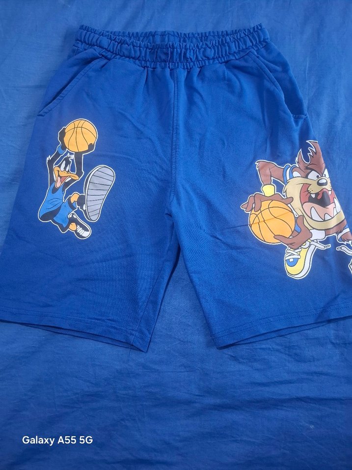 Rahat kesim, mavi renkli, renkli baskılı karakterlere sahip erkek çocuk şortu. Yumuşak ve sıcak kumaştan, kolay kullanım için Velcro bantlı. Trend sokak tarzı için uygun.