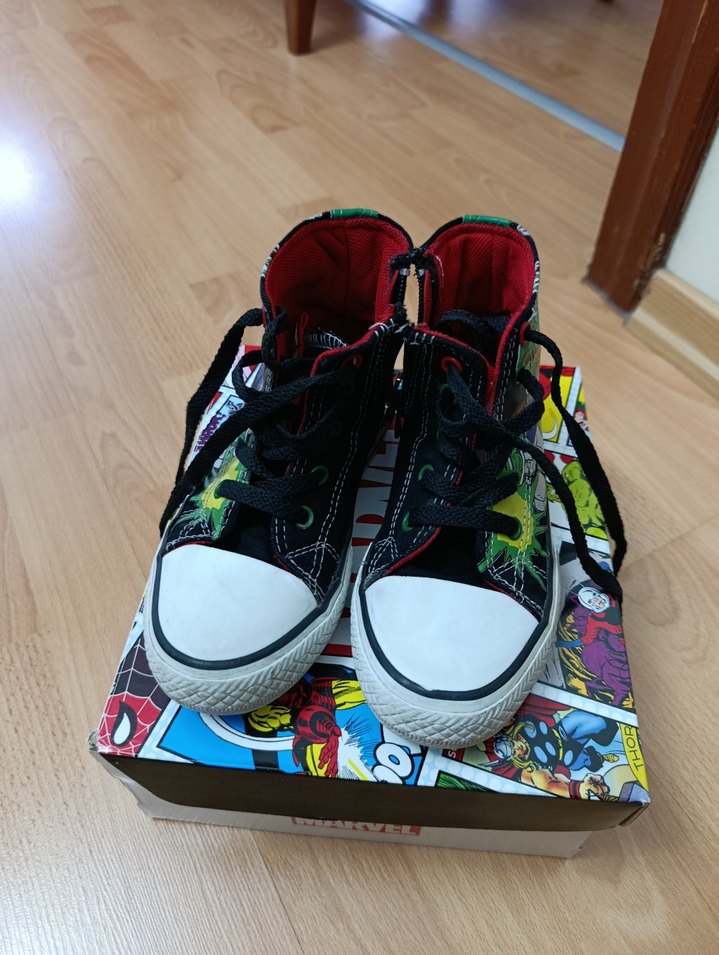 Renkli baskılı, lastik tabanlı ve cırt cırtlı erkek çocuk spor ayakkabısı. Bağcıklı ve fermuarlı, rock punk tarzını yansıtıyor.