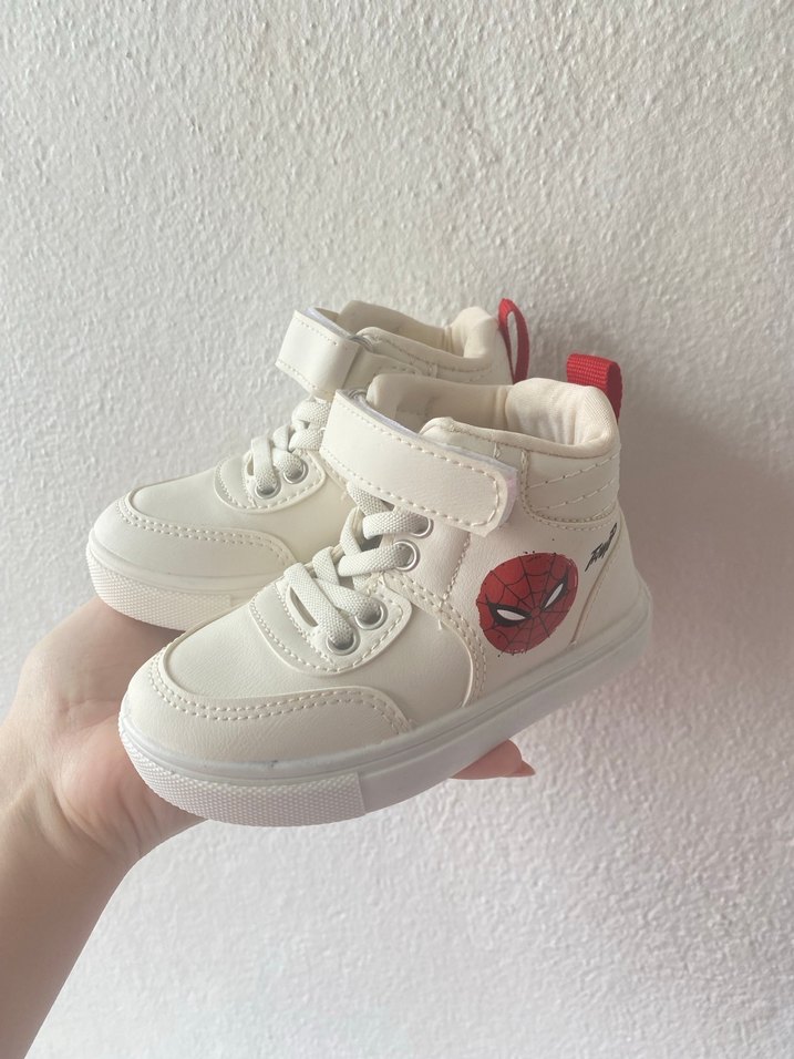 Renkli baskılı detaylara sahip beyaz erkek çocuk spor ayakkabısı. Kauçuk taban ve kolay giyilen cırt cırtlı bant içerir. 22 numara