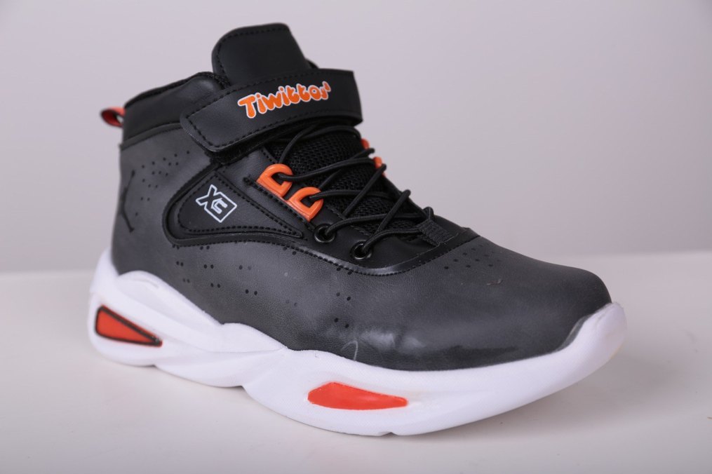 Renkli baskılı siyah spor ayakkabı, kolay kullanım için cırt cırtlı bant ve beyaz tabanda turuncu detaylar içerir. 'Tiwittoys' yazısı bantta yer alır. 33/34 Numaraları mevcuttur