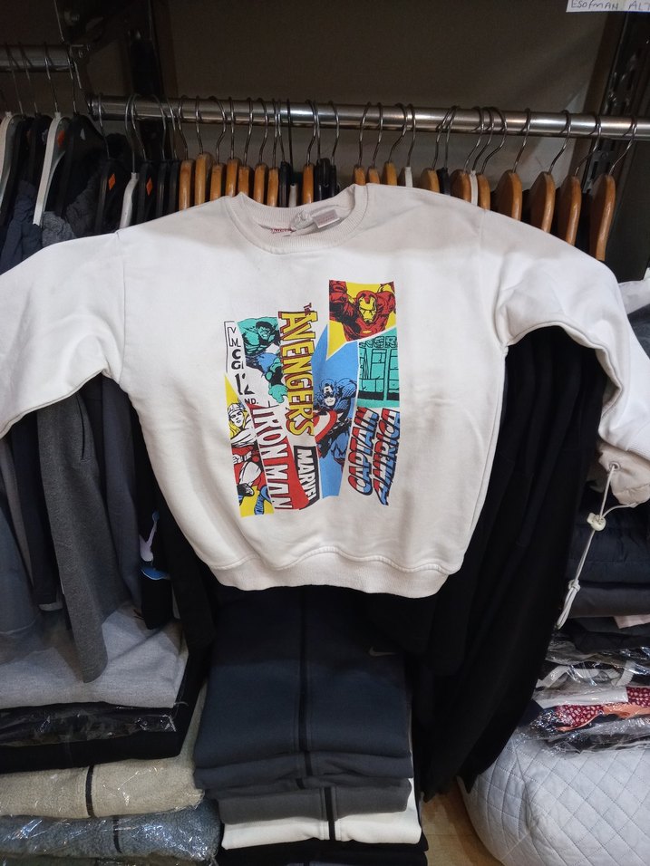 Yuvarlak yaka ve uzun kollu, bol kesim erkek çocuk sweatshirtü. Yumuşak ve sıcak kumaştan, renkli baskılar ve orjinal pamuklu temiz ürün 6 yaş en 44cm. boy 50cm