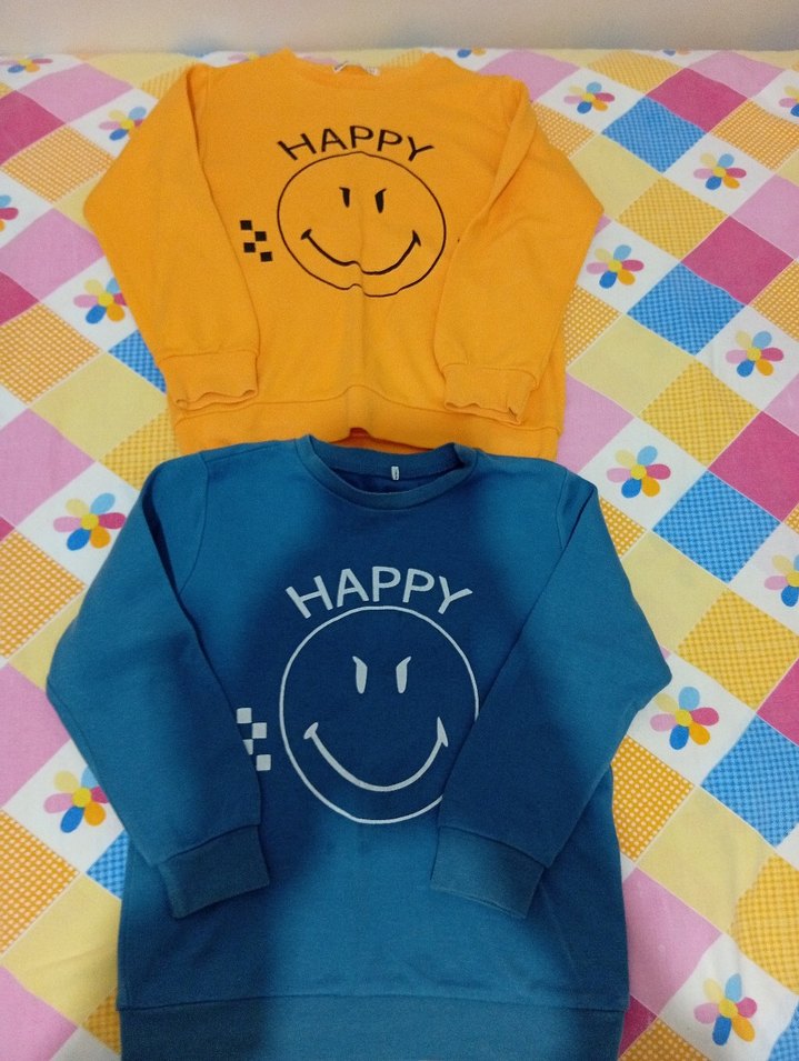 Uzun kollu, renkli baskılı ve örme dokulu erkek çocuk sweatshirtleri. 'HAPPY' yazılı gülen yüz deseni, bol kesim ve yuvarlak yaka ile rahat kullanım sağlar.