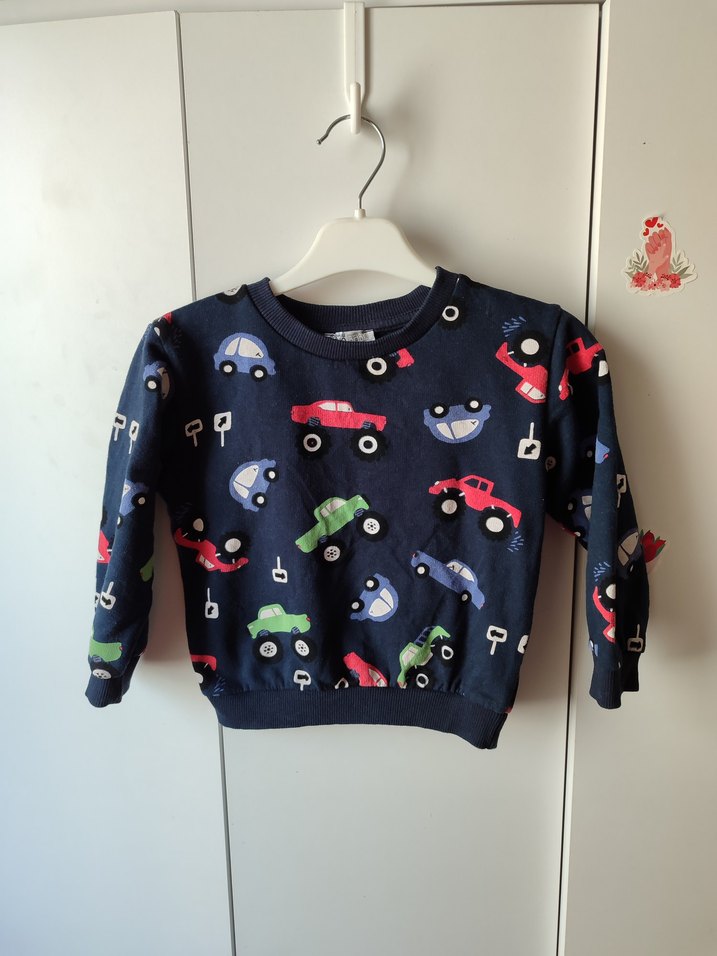 Rahat kesim ve uzun kollu, yuvarlak yaka erkek çocuk sweatshirtü. Yumuşak ve sıcak kumaştan üretilmiş, renkli araba baskılı desenle casual stil için uygun.