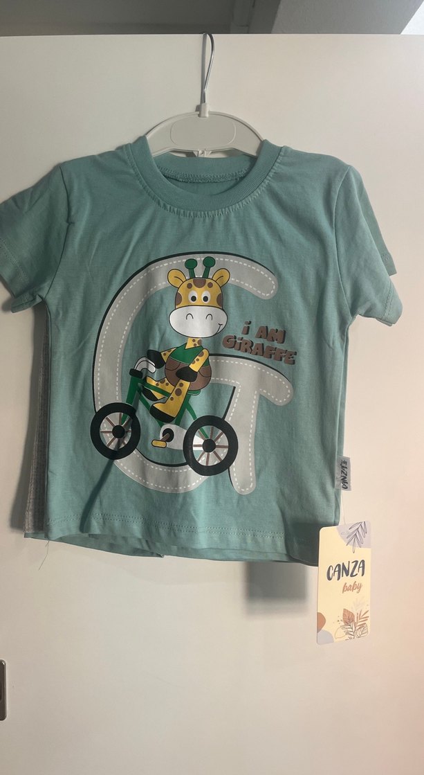 Yeşil renkli, renkli zürafa baskılı, yuvarlak yaka, kısa kollu ve bol kesim erkek çocuk tişörtü. Yumuşak ve sıcak kumaştan üretilmiştir. CANZA markalı.
