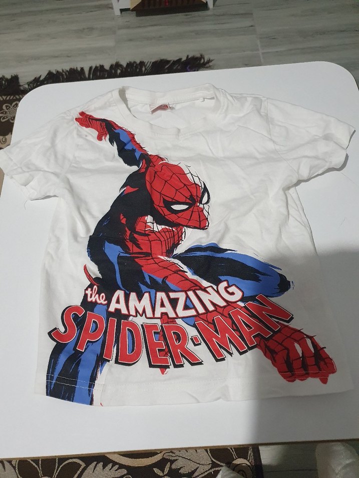 Beyaz zemin üzerine renkli baskılı Spider-Man figürlü, kısa kollu, fitted kesim erkek çocuk tişörtü, bisiklet yaka, street wear tarzında. ️