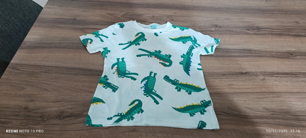 Renkli timsah baskılı, kısa kollu, yuvarlak yaka, bol kesim erkek çocuk tişörtü, sentetik kumaştan üretilmiştir.