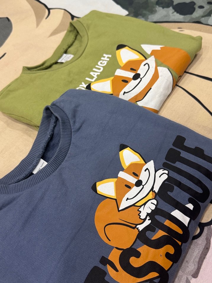 Pamuklu, rahat kesim, renkli tilki baskılı erkek çocuk kısa kollu sweatshirt, bisiklet yaka, günlük kullanıma uygun. Az kullanıldı solma yırtık lekeleri yok