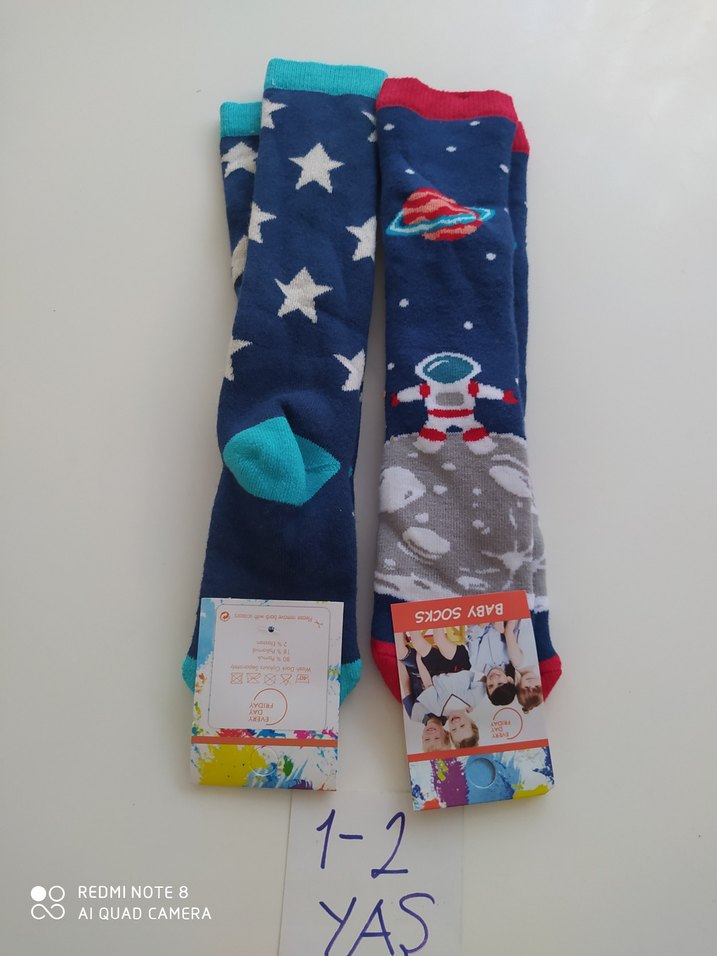 Uzay ve yıldız desenli renkli baskılı erkek çorabı, 1-2 yaş için uygun. Yumuşak ve rahat kumaş.