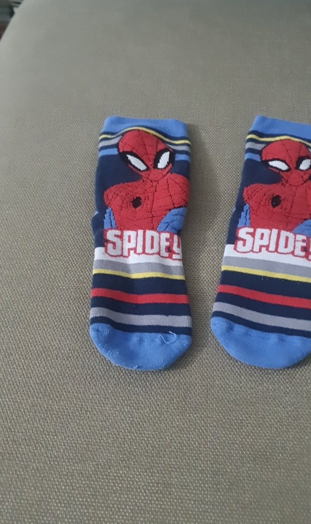 Renkli çizgili ve baskılı Örümcek Adam desenli mavi erkek çorabı. Üzerinde "SPIDEY" yazısı bulunur. 5/6 yaşa uygun
