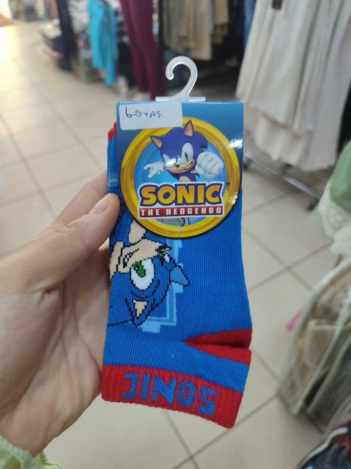 Mavi zemin üzerine renkli Sonic baskılı erkek çorabı, kırmızı detaylı, rahat ve canlı tasarım.