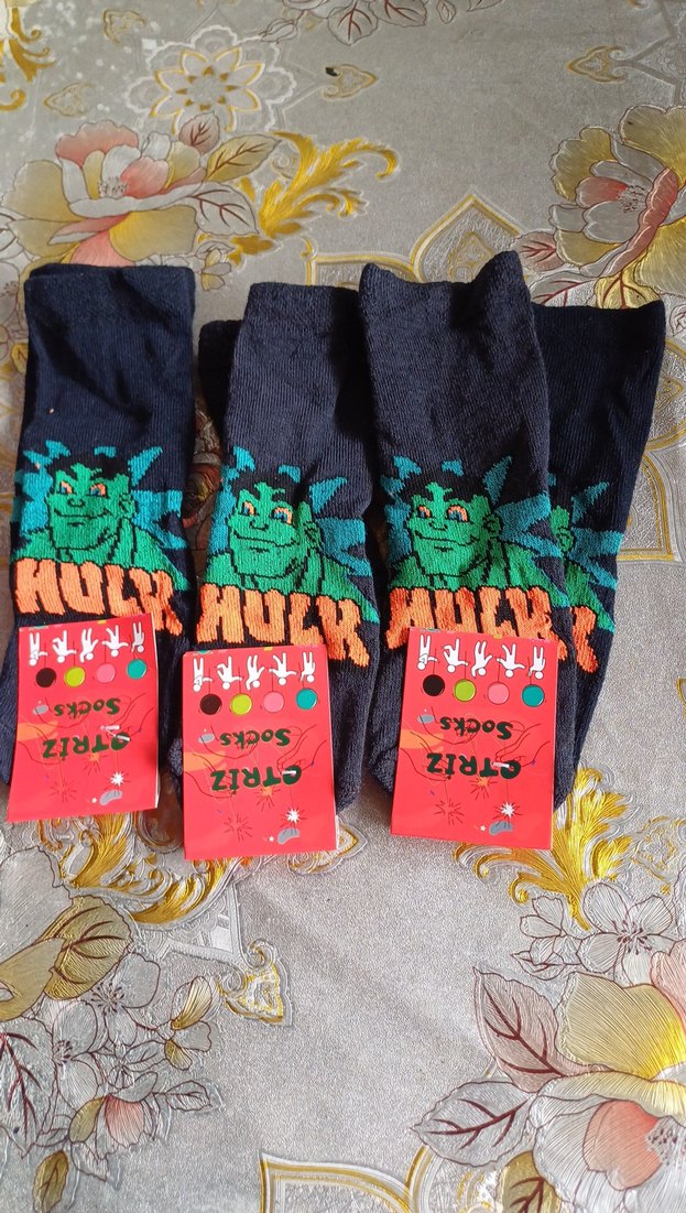 Renkli baskılı Hulk desenli erkek çorapları, yumuşak dokusu ile rahatlık sağlar. 4 ya da 5 yaş 3 adet fiyatıdır