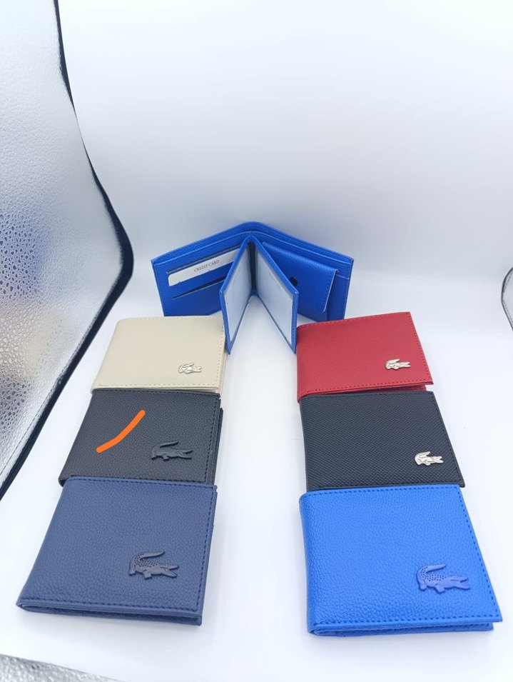 Mavi, kırmızı, bej ve siyah renklerde baskılı dokulu, iş kullanımına uygun çağdaş tasarımlı renkli erkek cüzdanları.