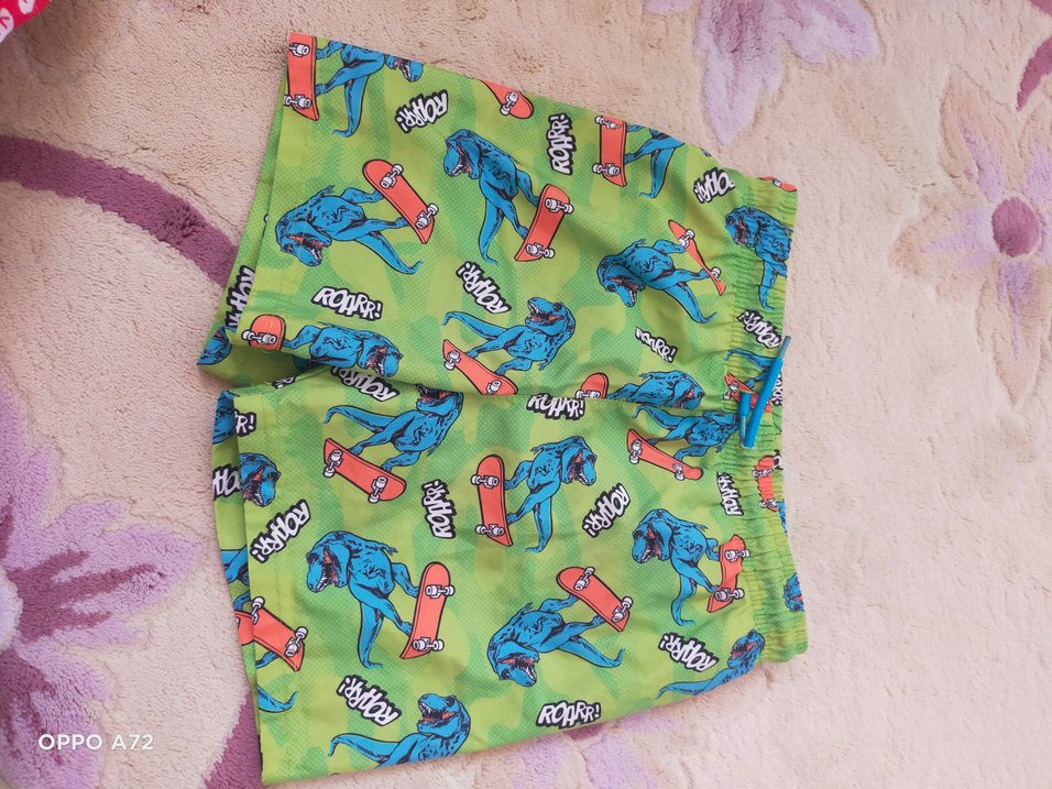 Renkli baskılı, bol kesim erkek şort. Kaykay yapan dinozorlar ve "ROARR!" yazısı var. Elastik bel ve sentetik kumaş kullanılmış.