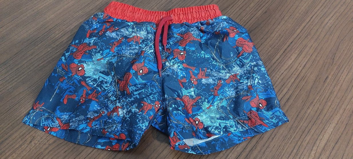 Sentetik kumaştan, renkli mavi tie-dye ve Spider-Man baskılı, fermuarlı cepli, kırmızı lastik ve bağcıklı, dar kesim erkek şort.