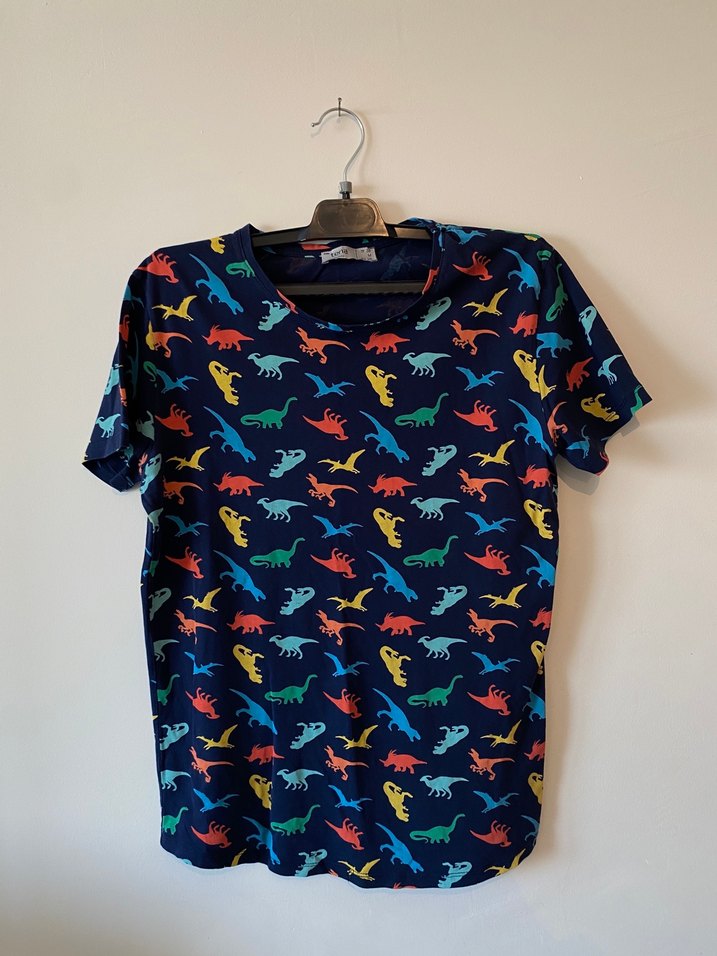Erkek tişörtü, bol kesim, yuvarlak yaka ve kısa kolludur. Yumuşak tekstil kumaştan yapılmış, renkli dinozor baskılarıyla sokak stiline uygundur.
