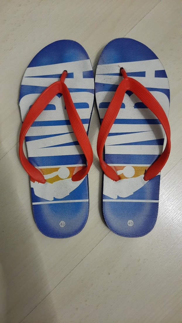 Erkek için renkli baskılı, mavi tabanlı, kırmızı bantlı, tokalı ve dayanıklı kauçuk terlikler. Rengi biraz solmuş.