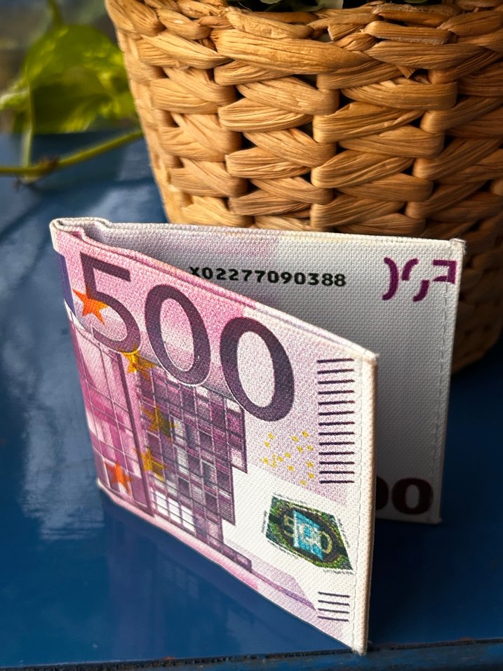 500 euro banknotu baskılı, renkli tasarımlı erkek cüzdanı. Parisli karşı kültür stilini yansıtan vintage görünüm sunar. Tertemiz #cüzdan #hediye #süs #dekor