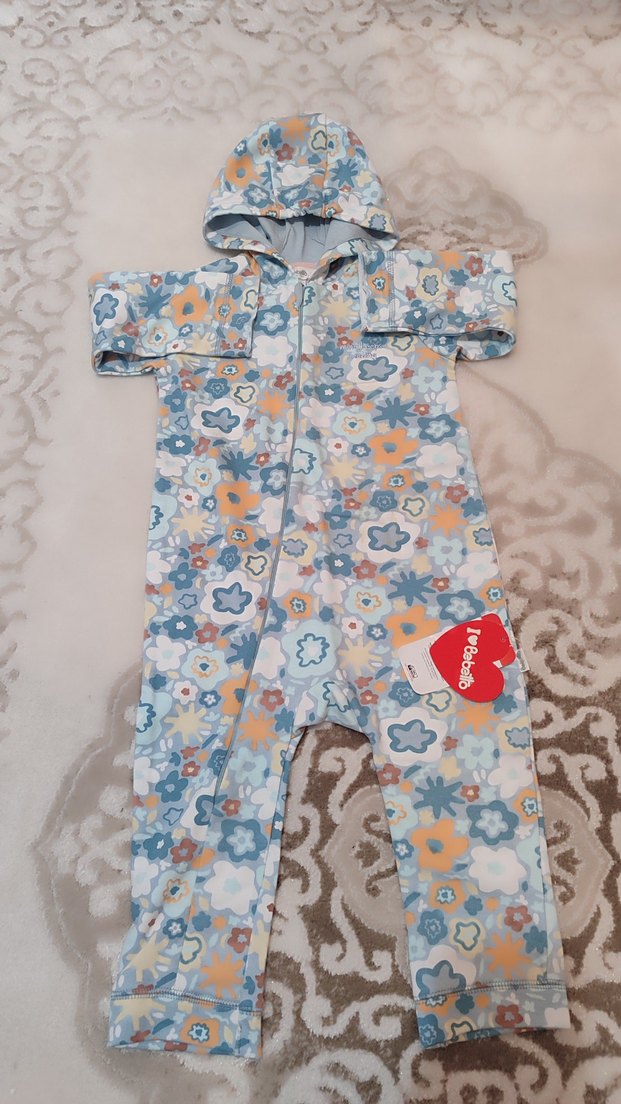 Renkli baskılı, kapüşonlu ve fermuarlı bebek kız tulumu, yumuşak kumaş ve çiçek desenli.sıfır etiketi üzerinde e bebekten almıştık 3 yaşa ama kalıbı 4 5 yaşa da olabilir.
