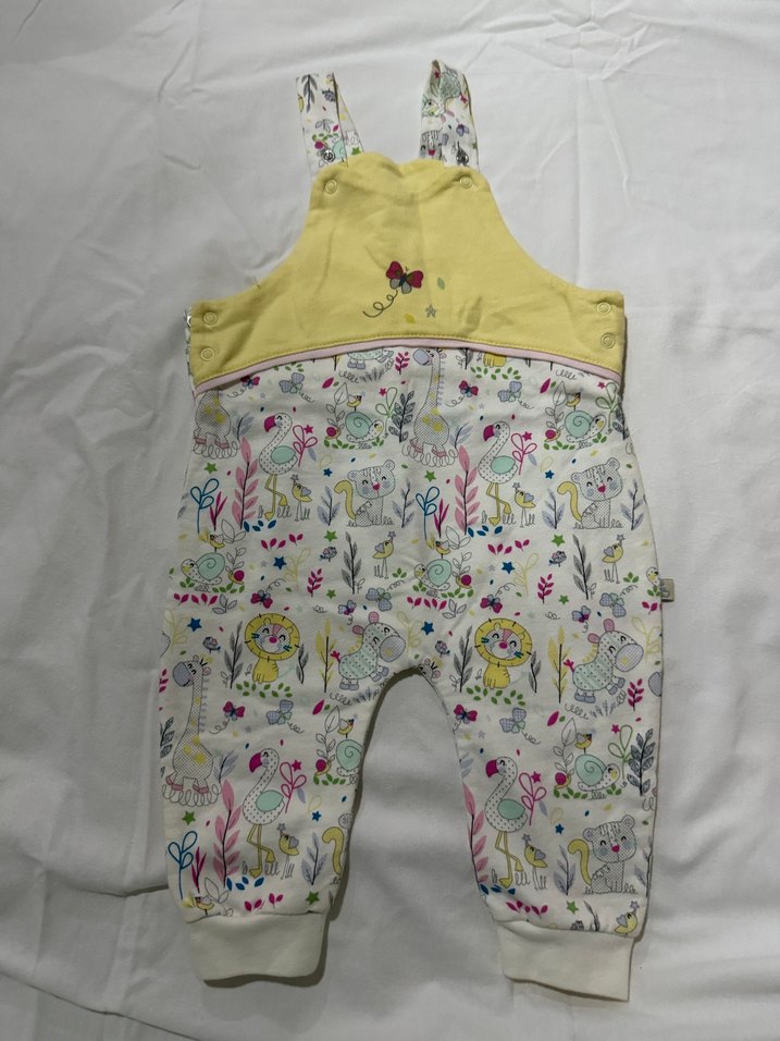 Renkli hayvan baskıları ve sarı üst kısmı fermuarlı, yumuşak kumaşlı bebek kız tulumu. 1 defa giyilmiştir e bebekten alınmıştır