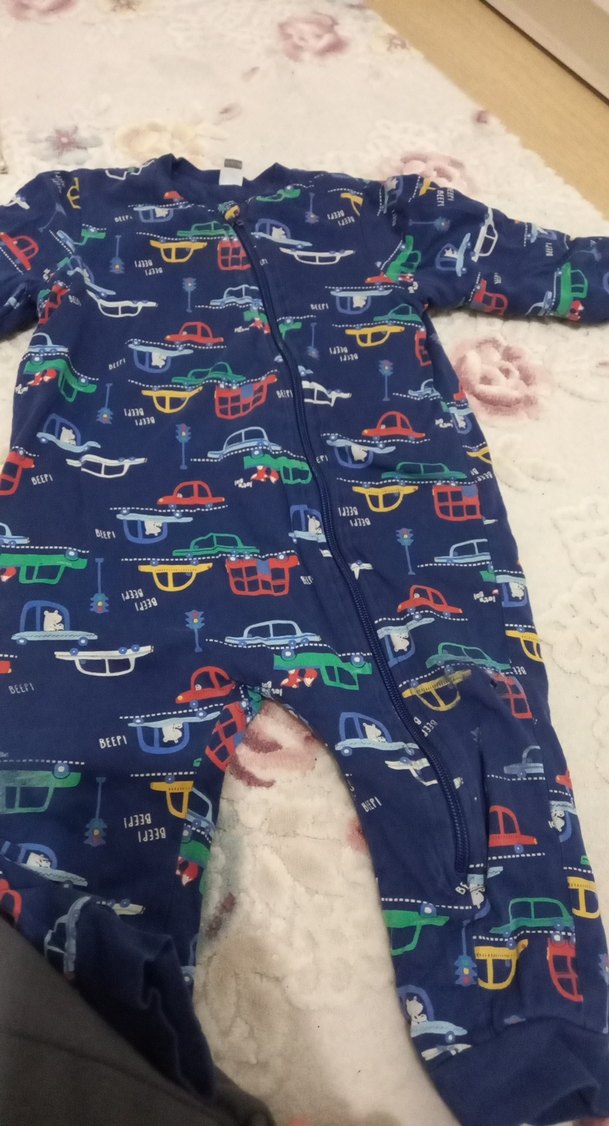 Renkli baskılı desenli, yüksek yakalı ve uzun kollu fermuarlı bebek tulumu, yumuşak ve sıcak kumaştan üretilmiştir.