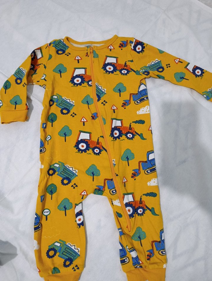 Uzun kollu, bisiklet yaka ve fermuarlı bu bebek tulumu, yumuşak ve sıcak kumaştan yapılmıştır. Sarı renkte, renkli baskılı ve streetwear tarzındadır.
