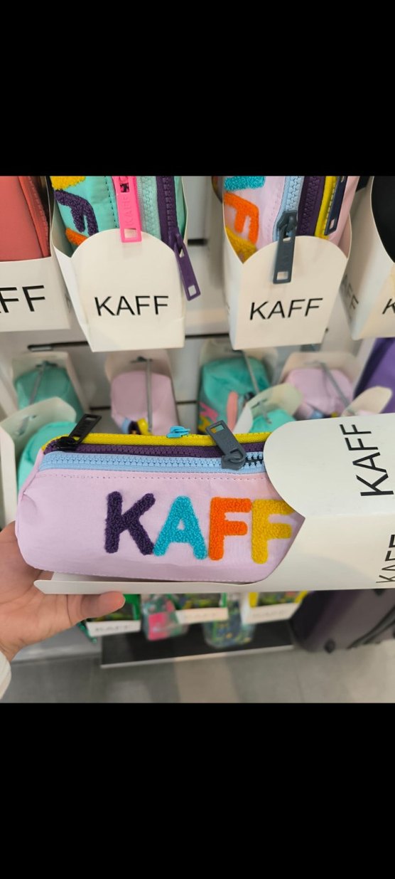 Fermuarlı kapanışı ve canlı pastel renklerde "KAFF" işlemeli baskısı olan çocuk cüzdanı. Trend belirleyici, avant-garde tarzda.