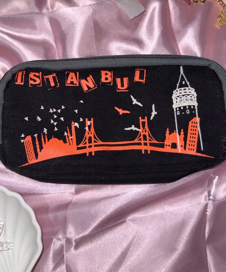Renkli, fermuarlı çocuk cüzdanı; İstanbul silüeti baskılı, sokak modası ve rock punk tarzında.