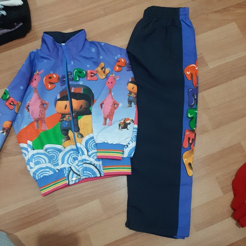 Renkli baskılı, fermuarlı eşofman takımı, yumuşak ve sıcak kumaş. Pantolonda yan şerit detayı bulunur.