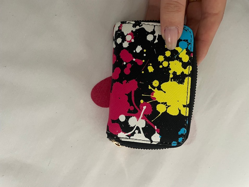 Kadın cüzdanı, renkli baskılı desene ve fermuarlı kapanışa sahiptir. Sentetik kumaştan yapılmış olup gündelik kullanım için uygundur.