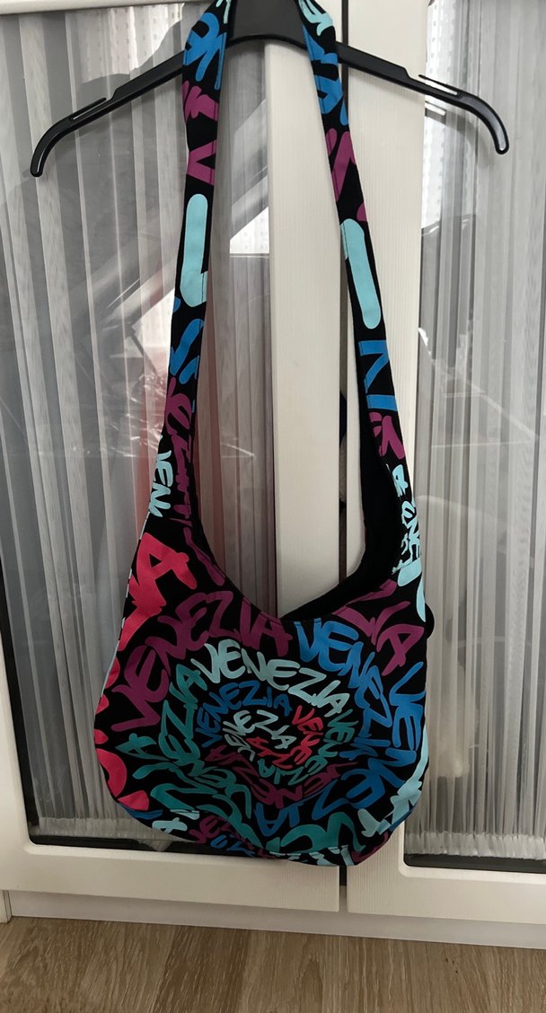 Renkli baskılı sentetik kumaştan fermuarlı omuz çantası, sokak stili ile günlük kullanıma uygun. Ürün Venedikten alınmıştır.Hiç kullanılmamıştır.