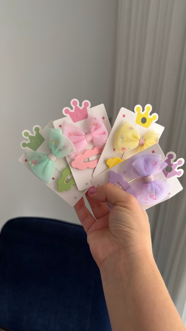 Pastel renklerde, baskılı fiyonk ve taç detaylı çocuk saç tokaları, pop kültür tarzını sevenler için uygun. Adet olarak satışta renk belirtin