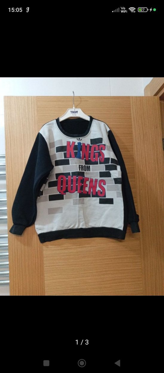 Gri renkli, uzun kollu, rahat kesim erkek sweatshirt. Yumuşak fleece kumaştan yapılmış, renkli baskılı ve örme detaylıdır. Önde "KINGS FROM QUEENS" yazısı bulunur.
