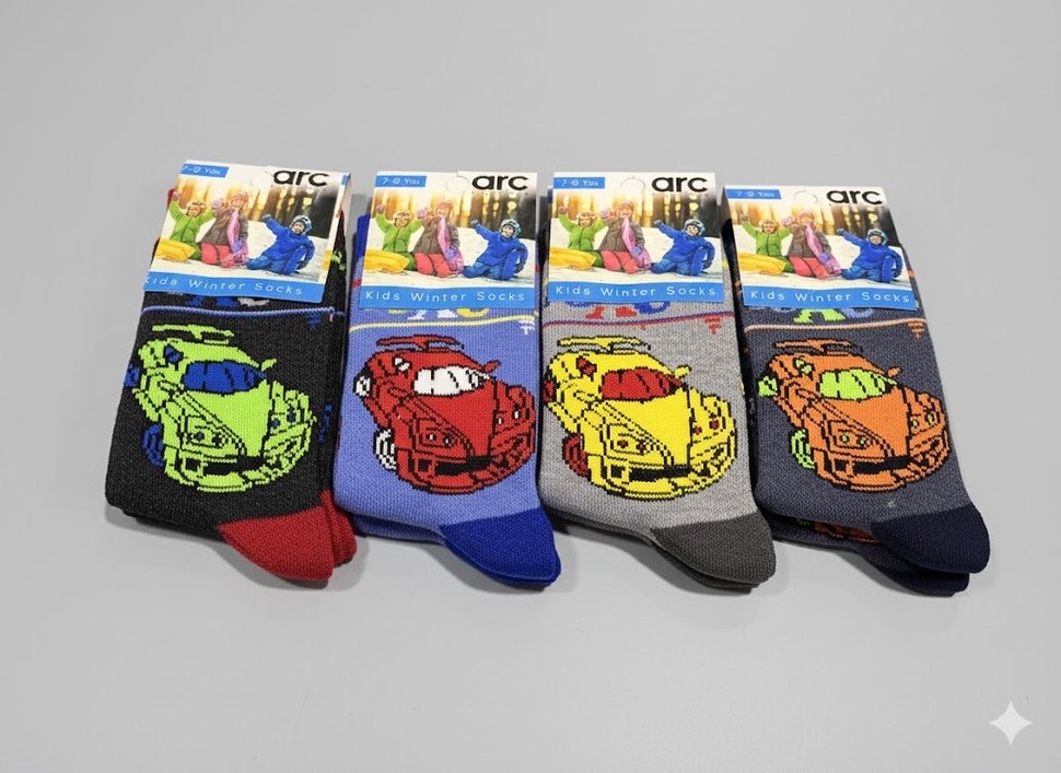 Baskılı araba desenli, çeşitli canlı renklerde renkli erkek çorapları, kış kullanımı için uygundur.